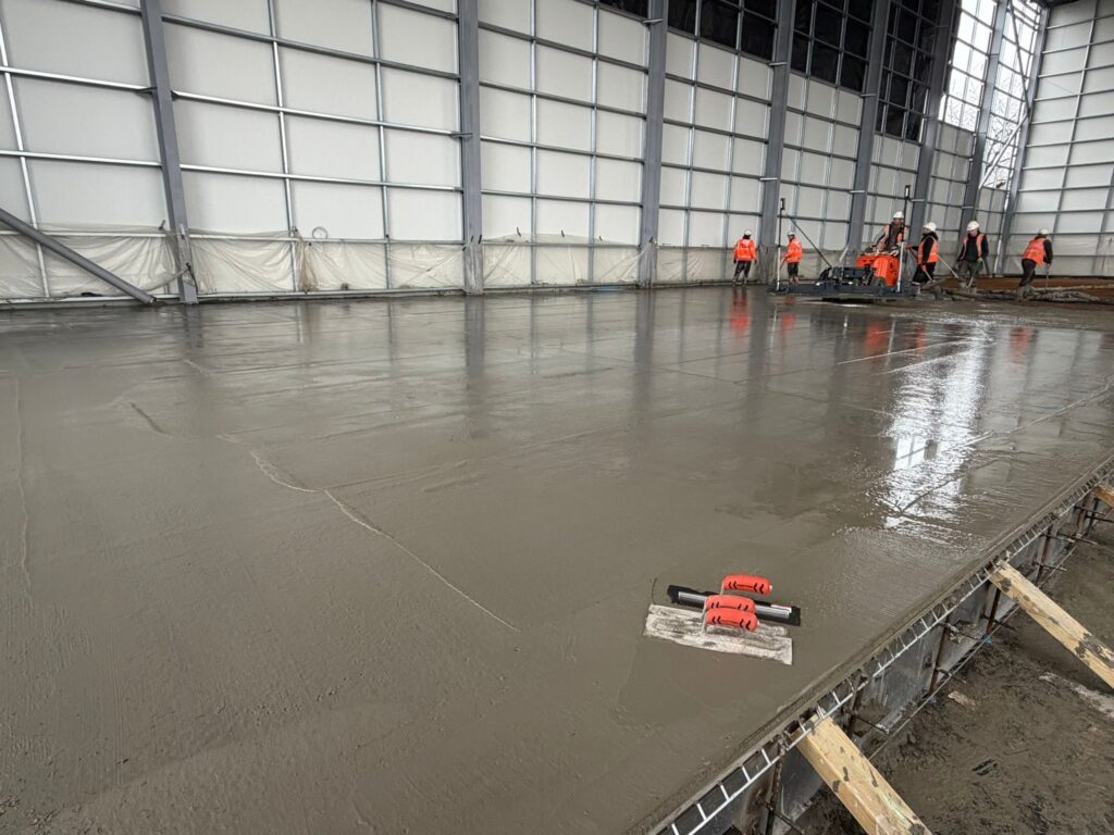 Concrete placement was carried out using concrete pumping techniques, allowing efficient installation across the slab area. The slab was levelled and compacted to FM2 tolerance using a combination of advanced methods, including a Somero Hammerhead mobile laser screed. This approach ensured exceptional flatness and accuracy, essential for modern industrial warehouse operations.